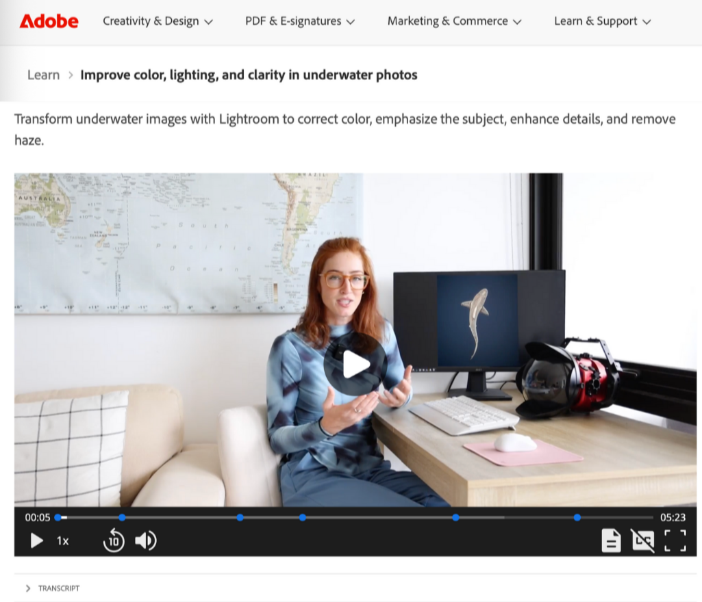 • I have been using Adobe Lightroom and shooting underwater photography for the last 7 years and just recently was contacted by the Adobe Learn team to make a tutorial for them for the website about my process. I have also delivered this exact workshop over 10 times in in-person events from James Cook University, the Sydney Institute of Marine Science and more!